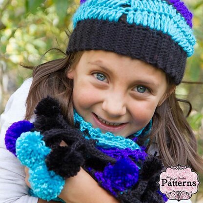 This is part of my Pom-Pom parade collection for kids. This hat and scarf set is a beginner crochet pattern. The hat is a simple slouchy beanie with a chevron design and a giant pom-pom topper. The scarf is a simple striped design with a pom-pom fringe. The set will fit girls 6-14 The pattern comes with pom-pom making instructions and templates for each pom-pom size.