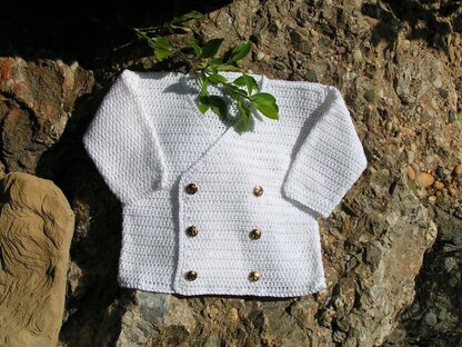 Easy to make, the double-breasted crochet jacket has neat edging, and the short trousers have an elasticated waist and two pockets (made separately)