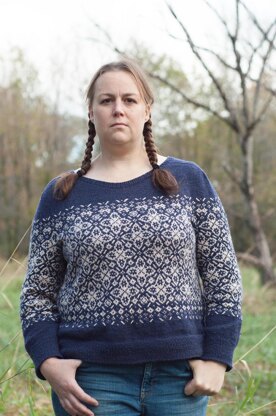 Snakeroot is noticeable for his unusual hybrid saddle-yoke construction. Saddles are introduced to add structure to the shoulders. The project is worked top down and seamlessly and requires short row shaping. The sweater is adorned with a block of stranded colorwork, which starts above the sleeve separation and ends a little over the ribbed hem. The resulting garment is chic, comfortable and easy to wear.