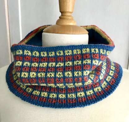 Der Snood ist rund gearbeitet, wodurch das kleine Fair Isle Muster ganz einfach und schnell gestrickt ist. Die Innenseite ist einfarbig glatt rechts gearbeitet. Durch die doppelte Lage ist er wunderbar warm und kuschelig.