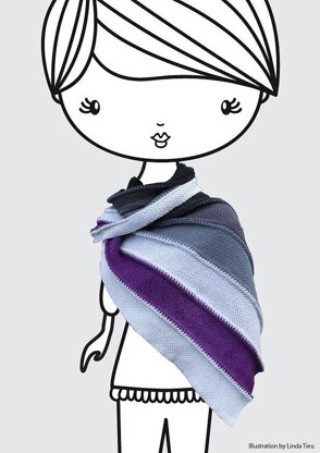 This shawl is wonderfully snuggly and great to wrap up in. It begins narrow and becomes broader as an asymmetric triangle with the top cut off. The shawl is crocheted in slip stitches, with stripes of cozy seed stitch and accentuated color changes.