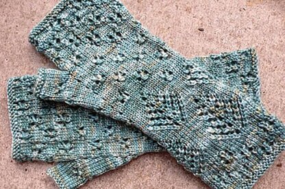 A mid-length mitt with allover lace motifs of pine trees and snowflakes, featuring a sculpted thumb gusset. Mitts are right/left interchangeable and may be resized by using larger or smaller needles and/or varying the yarn weight.