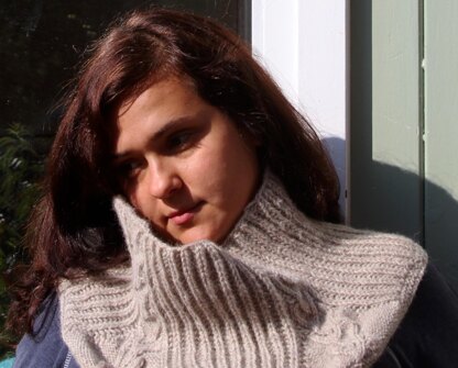 The cowl features a loose turtle neck, knit in brioche rib with decorative detail, which looks like a cable but it is not, and is really easy to work. The cowl then flares up towards the bottom so that it lies nicely over the shoulders which means that if your coat has a v-neck collar the cowl should fit in nicely without your clothes showing between the coat collar and the bottom edge of the cowl. It is warm and squishy and uses just one 100g skein of DK weight yarn. It is easy to make the cowl longer so that it can be turned down, but then please ensure you have enough yarn for that. How to do that is specified in the notes. If you have any questions please don’t hesitate to contact me. Thank you!