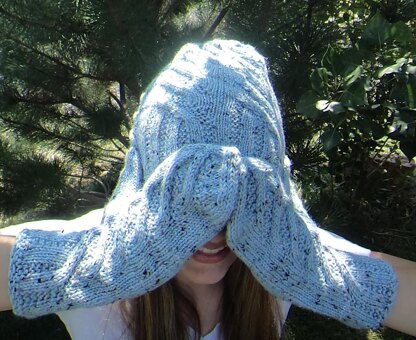 Mirrored, worsted-weight mittens in two sizes. Snow Swept Hat and Snow Swept Cowl are also available in the collection.