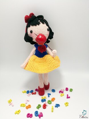 Snow white is an amigurumi doll with interchangeable clothes. Hands and legs are bendable. This a crochet doll pattern is for making the doll.