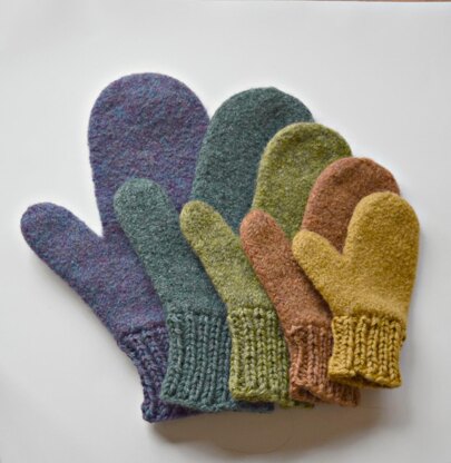 The mittens are knit in the round, then felted in a washing machine for a thick, durable finish. The cuff is added afterward for a neat, comfortable fit.
