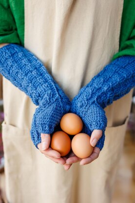 Inspired by “the fair maids of February”, these pretty gauntlets showcase a repeated snowdrop cable pattern and twisted cabled arms.
