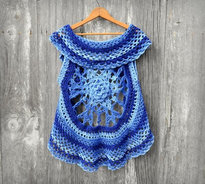 This is a crochet pattern, designed by me, for a circle vest that immediately draws the eye with its blue shades and large layered rose in the center of a delicate snowflake motif!