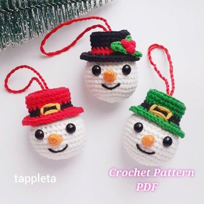 Snowman baubles with hats crochet pattern PDF. Christmas tree small decorations crochet.