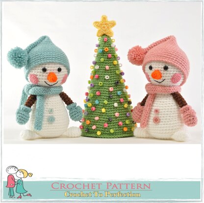 With this pattern you can crochet a lovely snow-girl and a snow-boy with a lovely Christmas Tree. Everything in the pattern is crocheted except the scarves. They are knitted by only using knit stitch.