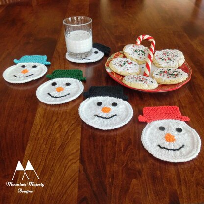 The snowman’s hat is knit flat first and is knitted directly onto the coaster. No seams, and no picking up stitches. This Snowman Coaster is worked seamlessly in the round from the outer cast on edge, decreasing to the center. A set of these can be worked up very quickly and would make a great hostess gift for holiday parties.