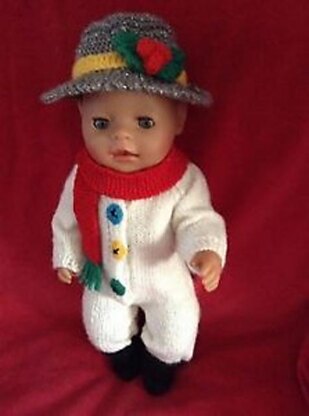 A festive Christmas Snowman costume knitting pattern for 15-18 inch doll (eg. Baby Born).