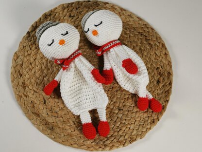 General information: this lovey consists of 2 arms, 2 legs, a head and a hat and scarf. At the head we crochet the body. While crocheting the body we crochet the arms and legs to it. The hat and scarf are sewn on the snowman. The nose and eyes are embroidered.