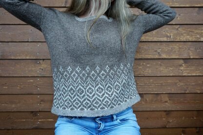 The Snowy Mountain Sweater is knitted seamless from bottom to top in the round with a color work hem. It starts with a 1x1 ribbing, followed by the color work. After dividing front and back for the sleeves, there is short row shoulder shaping. There are no shaping decreases and increases along the sides of the body. It will be worn with about 10-20cm (5-10”) of positive ease around the bust. The sample in Size S2 is shown on a 84cm (33”) bust.