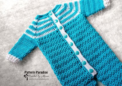 Oh how snuggly is this onesie? It hugs your baby with comfortable and stylish warmth. The front placket is long to make it easy to take off and put on. The stripes at the top add a bit of interest and offset the textured bottom nicely. Of course, you can play with the stripes and customize them to your liking.