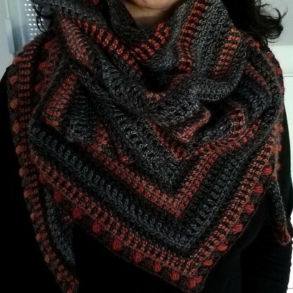 Snug for Tea is a cosy shawl made with double strands of yarn. It is made using a technic that allows you to progress without cutting yarn. So only a few ends to sew.