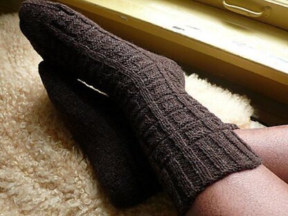 This top-down sock in four sizes features a unisex motif of gridded squares which extends down the leg and over the top of the foot. Comprised of a simple arrangement of knits and purls, the pattern yields a deep, cushy texture with a cozy appeal. Sock is easily converted to toe-up construction, as the pattern is vertically reversible.