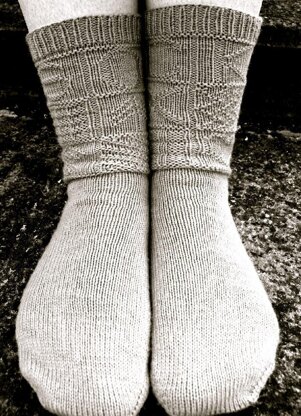 Aspects of these knitting traditions have been taken and played with to make these Gansey socks. The socks, like the sweaters, are worked in the round using some traditional motifs (and some original ones), with a false-seam of purl stitches at the sides, and they are plain on the feet. Since socks with heels cannot be reversible, the pattern has been reversed such that the back of one sock is the same as the front of the other. Socks are worked toe up, with a flap-and-gusset heel. The motifs are charted.