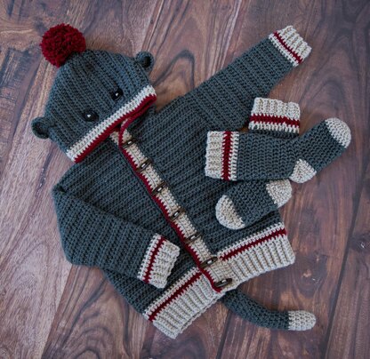 PDF crochet pattern for Children’s Sock Monkey Hoodie with matching Socks. Fun whimsical design features Sock Monkey hood with ears, ribbed edging with wooden buttons. Pattern is worked in half double and single crochet stitches. Quick sock design is worked in double crochet stitches with ribbed cuff. Sock pattern includes a full video tutorial available on mjsoffthehookdesigns.com also a Hoodie Assembly and sewing instruction video tutorial is included.