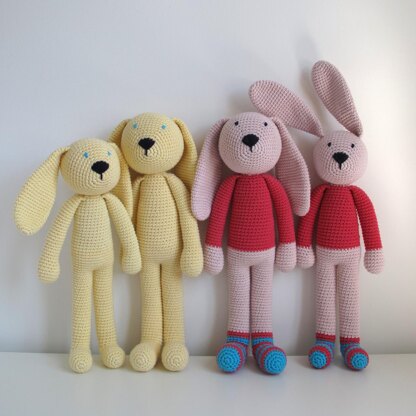 These amigurumi rabbits come in two sizes: LETIZIA (large) and LETI (medium) and they are SOCK LOVERS! - Make them striped socks, socks to match your own favorite pair, long ones, short ones, in your favorite team colors, Christmas socks, Halloween socks or two different ones….!!!