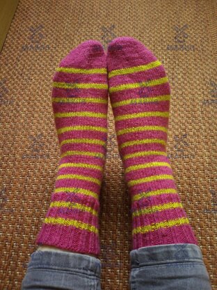 “Giggledance” is a knitting pattern for relatively thin but still warm striped wool socks with a boomerang heel. One can knit them either toe-up or top-down (both versions are included in the knitting pattern).