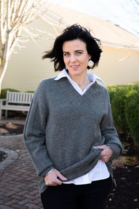 This soft, boxy pullover in 12 sizes (XXS to L) and [1X to 7X] has a relaxed, drop-shoulder fit that provides swathes of warmth while remaining light and airy. The body is knit in soothing stockinette trimmed with wide, flat ribbing, which is featured in the contrasting, tone-on-tone sleeves. With two neckline options—a dramatic V or cozy crew—and two body lengths included, it can be knit to virtually any desired length. Worked from hem to neck, in flat pieces, and seamed afterward for portability and a stable fit. Long version is approximately 4 inches longer at side seam.