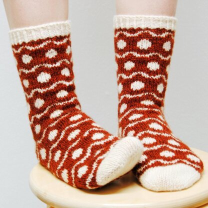 Soft Spots are worked from the toe up in two colors of sport-weight yarn. The socks are available in two sizes: 48 and 64 stitches. The pattern is written with both metric and US terminology. The stranded colorwork pattern is charted only.