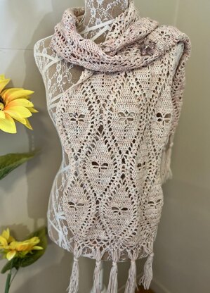 It features a pattern repeat using basic stitches, but careful attention to stitch placement is important for best results. While the stitches themselves aren’t difficult, a bit of concentration will help everything fall into place beautifully. This scarf is worked flat and in rows.. The edging and fringe at both ends is worked last.