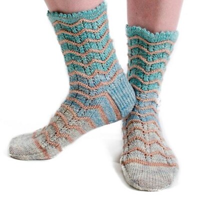 These socks feature a simple garter stitch stripe and eyelet lace. Knit from the top (cuff) down with a wide toe and a flap heel, they are available in two foot circumference sizes; the foot length may be customized. The pattern is written for DPNs, but may also be worked using 2 circulars or Magic Loop techniques.