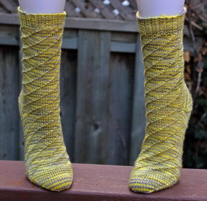 Though instructions are given to knit these socks cuff down, the pattern is the same in both directions. The simple pattern repeat makes this a quick, meditative and relaxing knit.