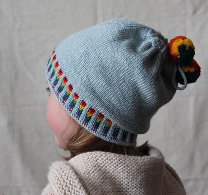 The hat is knit in the round; it begins with a corrugated ribbing brim; the body of the hat is knit without shaping, and it is finished with a folded brim. The top of the hat is drawn closed using an i-cord with rainbow pom poms. The pattern include pom pom guidelines.