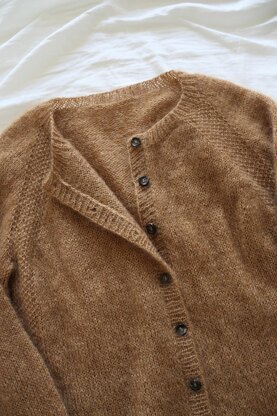The cardigan is knitted top down flat. First the back neck is shaped using short rows followed by a raglan yoke. The raglan lines are knitted in Seed Stitch pattern while the rest of the cardigan is knitted in Stockinette Stitch to create a stitch contrast. After dividing the work in sleeves and body the raglan lines go over to side stripes that continue in Seed Stitch pattern. The sleeves are knitted in round using Stockinette Stitch. The design is finished by knitting a facing for the buttons along the front in Ribbing Stitch. All cuffs are worked in Ribbing Stitch pattern too.