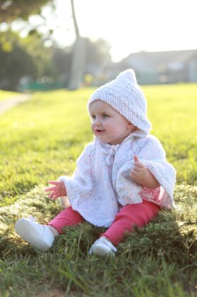 One size hooded cape fits baby for a surprising amount of time, from wrist length to elbow to shoulder cape and everything in between. Moss stitch edges with a tie closure; cables or lace- your choice!- highlight the raglan shaping lines. Knit from top down.