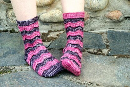 The pattern is written with both metric and US terminology. Both written and charted instructions are given for the lace pattern. Right and left socks are knitted identically and can be worked two at a time.