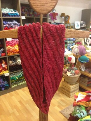 Basic ribbing is thrown for a loop in this infinity scarf that never ends until you want it to. Each successive round skews the pattern by one stitch, tilting the vertical ribs and eliminating the need to keep track of row counts. Make the scarf as narrow or as wide as you desire. (Remember to adjust yardage accordingly.)