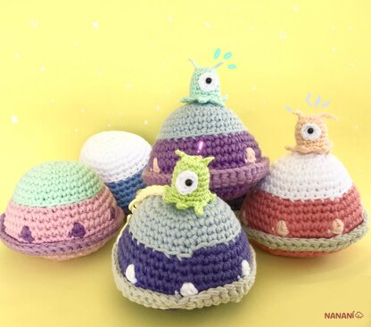 Spaceship: • A) Light blue: Cotton 8/8 yarn. • B) Blue: Cotton 8/8 yarn. • C) Pastel Yellow: Cotton 8/8 yarn. • Polyester fiberfill stuffing