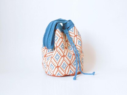 A practical medium size drawstring bag to practice tapestry crochet with back loop single crochet, wrapping two colors at a time.