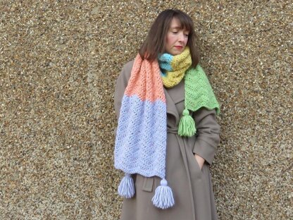 Crocheted in a wonderful wavy chevron stitch using all five shades of Puffin Speckled by Quince & Co. A plump, pure wool yarn with multicolored specks of 'confetti'. Oversized tassels finish off the stole.