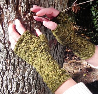 Spectacle Lake Mitts evoke the reeds and rippling currents of a peaceful retreat near home. The simple lace flows continuously around the back of the hand and onto the palm with reverse stockinette thumbs and garter stitch edgings for a crisp look fit for an autumn walk.