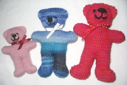 Use any yarn from 4 ply to 8 ply/DK – great for using up sock yarn leftovers as it takes only 10 gms of 4 ply to make a 14 cm tall bear. Patterns are given for a garter stitch and a stocking stitch version.