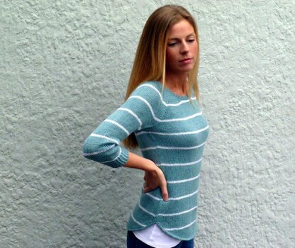 A top-down raglan construction and a quirky shirttail hem make Sperry fun to knit — cool stripes and a lightweight yarn make it fun to wear.