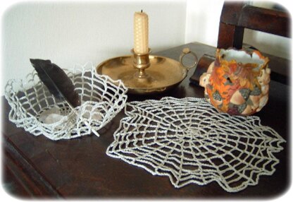 Smaller cobweb doilies and bowls can be worked for a hallowe'en setting, using No 80 crochet cotton and a size 0.60 mm hook. These will be approximately half the size shown above and the doily for example could then be used as a coaster.