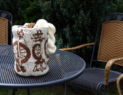 Rund gestrickter Beutel in Jaquard-Technik. Der braune Faden wird über weite Strecken eingewebt, da das Muster groÃe einfarbige Flächen aufweist. In der Anleitung wird die Jaquard-Technik und das Einweben des zweit