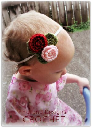 Pattern includes directions for flowers and leaves, plus a standard head circumference size chart to make the headband in sizes newborn to adult.