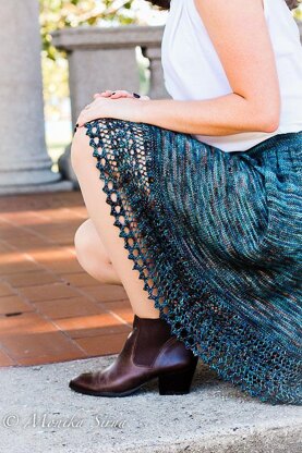 It is a gathered skirt adorned with a delicate lace hemline. The skirt is worked from the top down, starting with a waistband that allows for an encased elastic. The lace hemline is knitted-on (sideways) to the live skirt stitches, and the lace is seamlessly joined at the end. Smooth fabric with lovely drape will move beautifully as you walk.