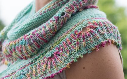 Splish Splash is a shawl with a fun and frilly brioche knit edge. All the brioche stitches needed have explanations and linked video tutorials and you are only required to do a few brioche decreases here, the rest of the pattern is all regular knitting! Slip stitches and a fancy looking Estonian lace increase happen all before the brioche fun begins! The top down shawlette is just the right size to sit on your shoulder and to be fun to knit, yet remains portable, for that sideline-at-your-kids-sports-event or on the road travel knitting!