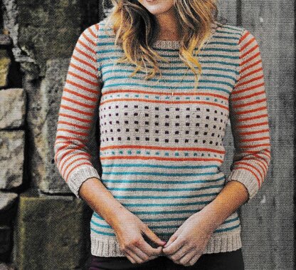 This is a pattern for a Stripes and Spots Jumper, originally published in Simply Knitting. It is a simple shape with 3./4 length sleeves, in stocking stitch stripes and fairisle. 2 x 2 rib edges. Photos Simply Knitting.