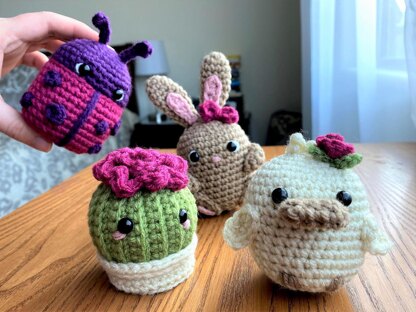 A happy set of beans that are perfect as small gifts or spring decor! This pattern includes instructions for 4 figures: bunny, duckie, ladybug, and cactus.