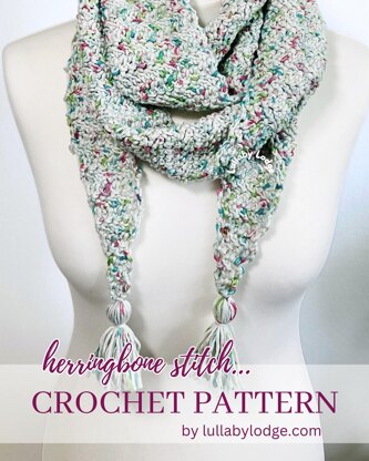 Crochet this gorgeous scarf in pretty cotton yarn. Perfect for those inbetween days we get in spring. Add a touch of class to any outfit. This crochet pattern is easy enough for an adventurous beginner and very quick to make. Crocheted in the herringbone double crochet stitch throughout, with pretty tassels. Give the gift of a Spring Embrace to someone you love, or treat yourself...