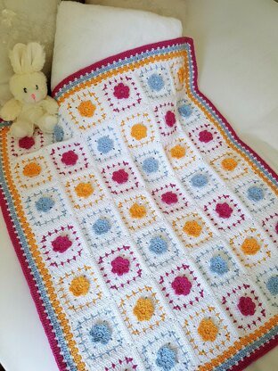 The colours of this cute blanket remind me of spring: a bright yellow sun visible through glimpses of blue sky, and bright pink spring flowers peeping their heads out of the warming ground.